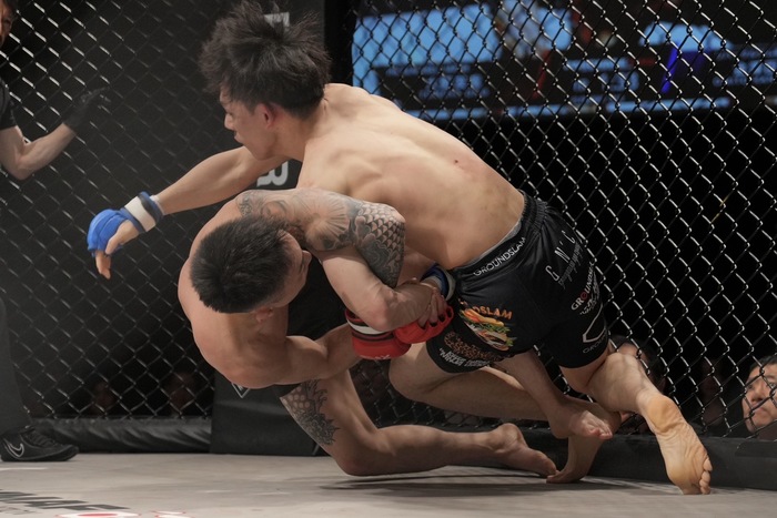 2R、初回に逆転された大野が右を突いてケージに詰めてダブルレッグテイクダウン。クローズドガードの金澤は下から三角絞め、十字に移行も大野が抜けると、両者立ち上がり。詰める大野に金澤は大内刈でテイクダウン。立つ大野はバック引き込み、正対にツイスター狙いも、外してトップの金澤。