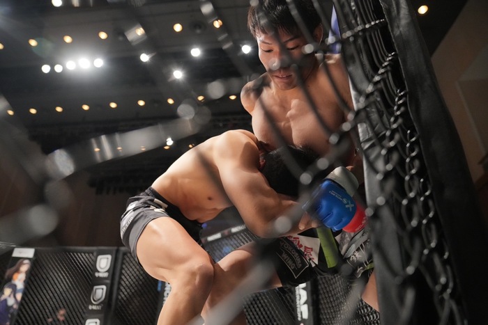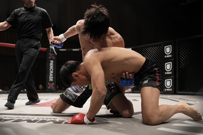 1R、目怒のシングルレッグに跳びヒザを合わせに行く清水。なおも足を手繰る目怒が左で差して押し込み。清水のローブローで中断、再開。