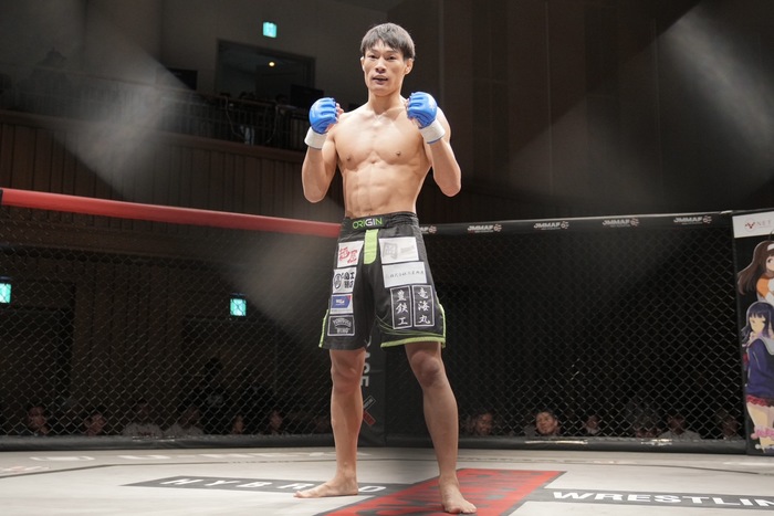 目怒の突進からシングルレッグを切った清水が右を突き、サイドバックからパウンド! 目怒のクラッチが切れ、パウンド連打にレフェリーが間に入った。清水が準決勝進出。
