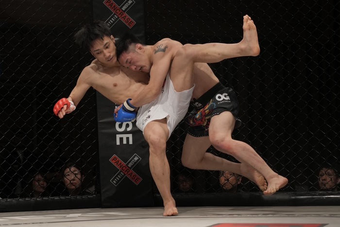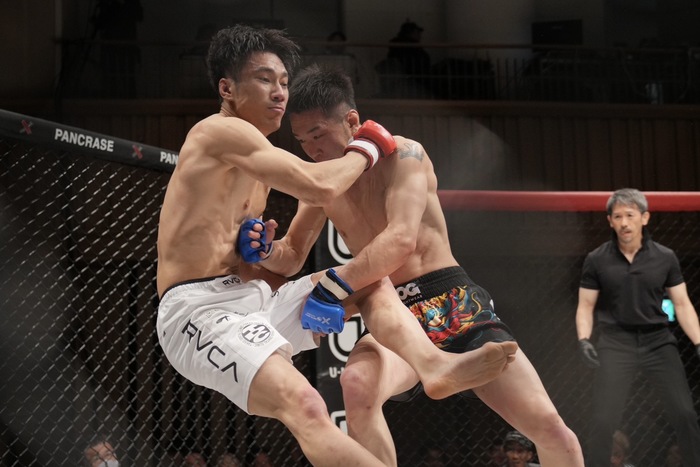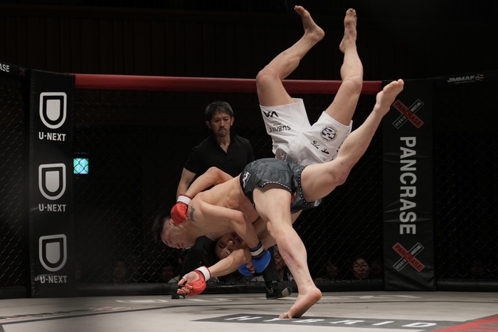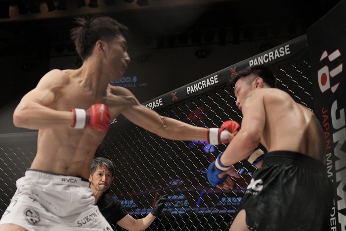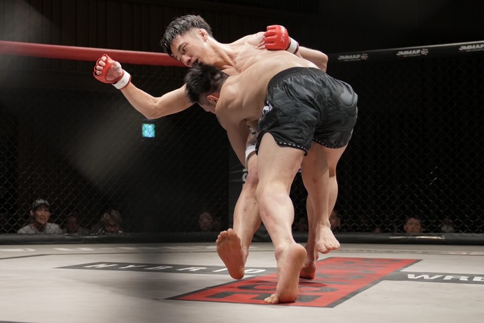 2R、福里は組んで投げも立つ沢木。福里はシングルレッグから払い腰テイクダウン! ここもすぐに立つ沢木。福里は右オーバーハンド! 強引な首投げに首を抜いて立つ沢木。さらに組んで来る福里を突き放した沢木は左ジャブを刺す。