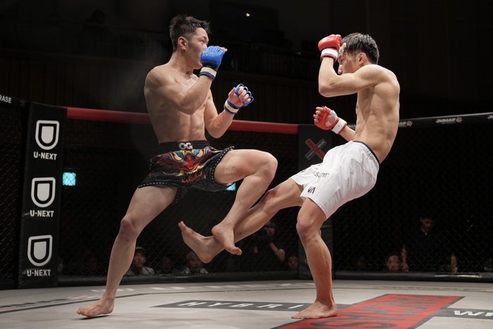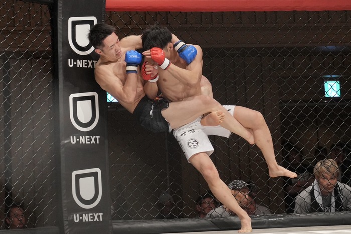 1R、ともにオーソドックス構え。ワンツーの沢木、福里も左ジャブを見せる。右前蹴りの沢木に福里がシングルレッグからケージに押し込み四つ、左ヒザ。沢木は腿に鉄槌。体入れ替え離れると右ミドルハイ。福里も左ジャブを当てる。左ローには右ストレートを狙う沢木が右ローをヒット! さらに右カーフ。
