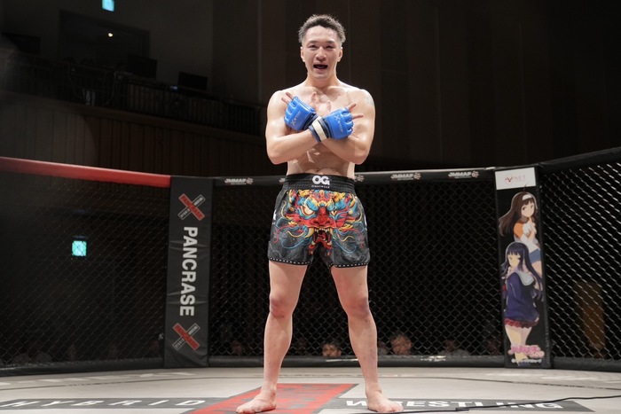 さらにボディロックテイクダウン! 立つ沢木はワンツーで前ががりに。そこに再び組んで小外がけテイクダウンの福里がサイドを奪い、福里のラウンドに。判定はスプリットに割れ、2-1で福里が熱戦を制した。