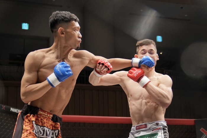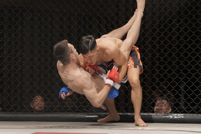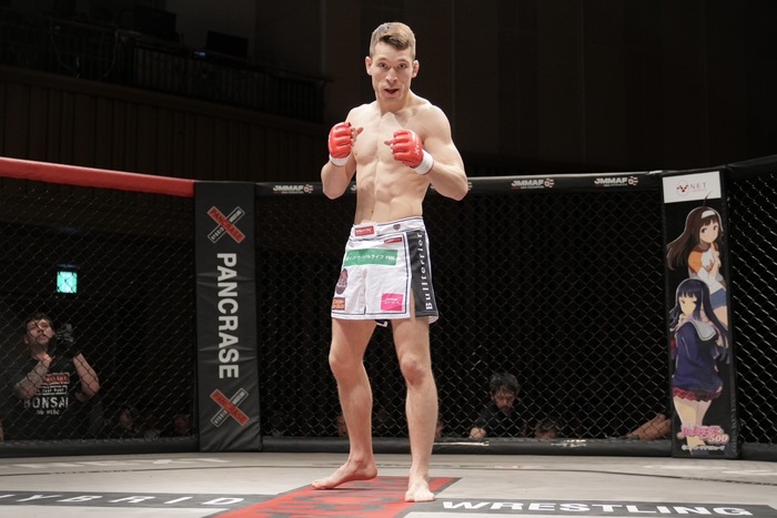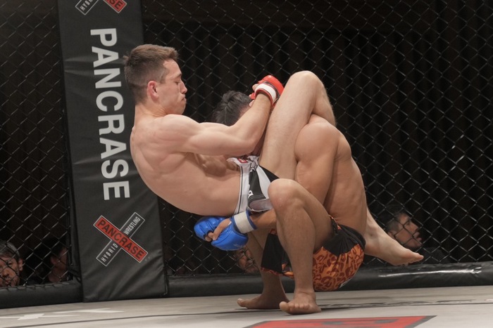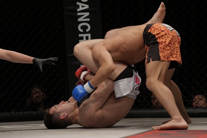 1R、サウスポー構え、ボンサイ柔術の佐藤は左の蹴りから。木本も右ローは空振り。木本の右にダウンした佐藤が組んで右オーバーフックで引き込み。左オーバーフックに切り替えも離れる木本。佐藤は足にからむが、木本はパウンドから足を抜き離れる。詰める佐藤は再び引き込み。