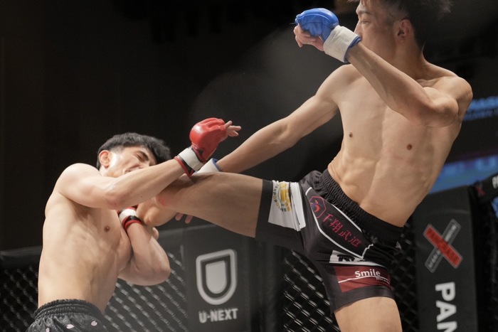 1R、オーソの木村は手を低い構え。サウスポー構えでRISE出場経験もある水島は右ロー、左インロー。木村は右から左ミドルも遠い。左ジャブを見せる。ワンツーの左の水島が圧力。ケージ背から出た木村は右ボディストレート。左突き、左インローを当て逆ワンツーの右で木村を崩した水島だが、木村はシングルレッグからバック狙い。