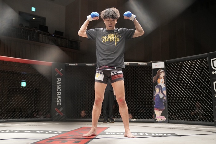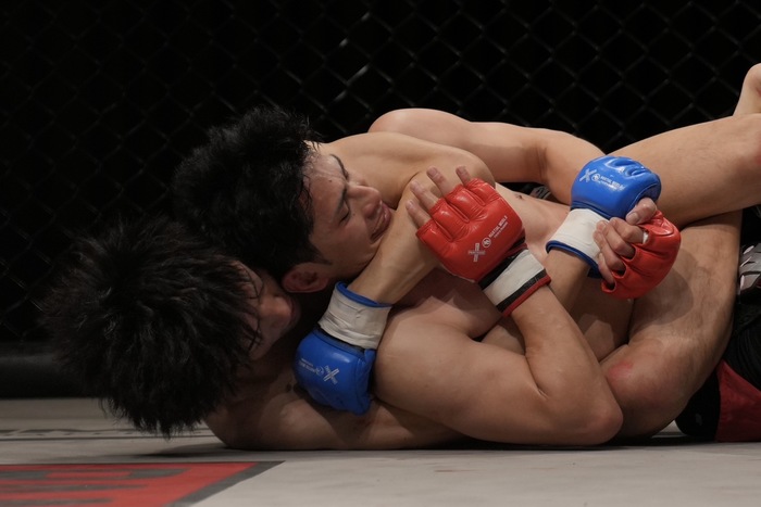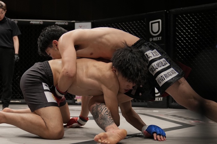 2R、先に詰める木村が崩してバックに。スクランブルの水島に両足をかけて4の字ロックからリアネイキドチョーク狙い。長い時間をコントロール。腰をずらして離れた水島。なおも木村が遠間からシングルレッグ、スプロールする水島。木村は鼻から出血も遠間から右ハイをブロック上に突く。3者木村を支持、木村が取り返した。