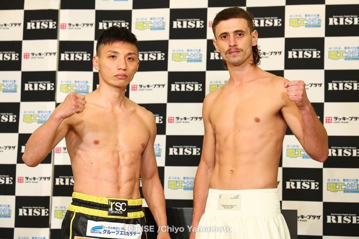 メインイベント(第10試合)の初代RISE世界スーパーフライ級(-53kg)王座決定戦3分5R無制限延長Rで対戦する、大﨑一貴(OISHI GYM)とコーリー・ニコルソン(オーストラリア/ Ironfist Gym)は共に53.0kgジャストで計量をパス。