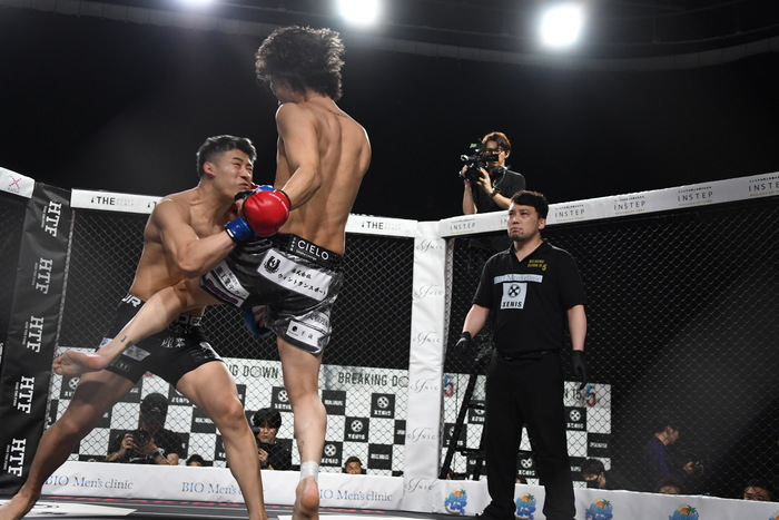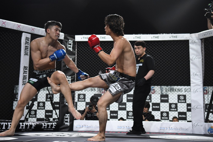1R、サウスポーの足ポキは左ミドルから左のヒザを連打していくが虎之介がテイクダウン。すると足ポキは予告通り足関節技に。これはブレイク。スタンドで足ポキは右カーフ、虎之介は左フックを繰り出すが大振りで足ポキはヒザを突き刺す。
