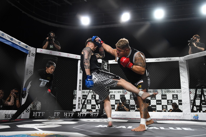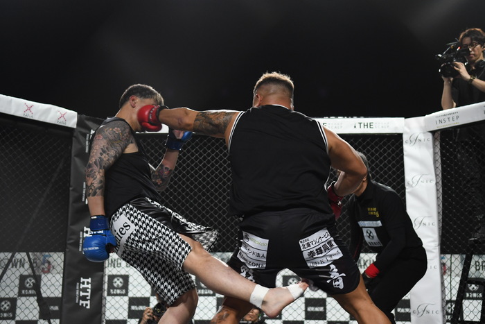 1R、以外にも両者距離を取ったパンチの打ち合いとなったが、右ローを蹴って左右連打するマスターキーにトトロが突進。ケージを背負ってパンチを打ち返すマスターキーにトトロが左右フックを打つ。