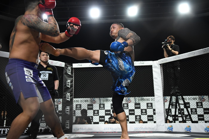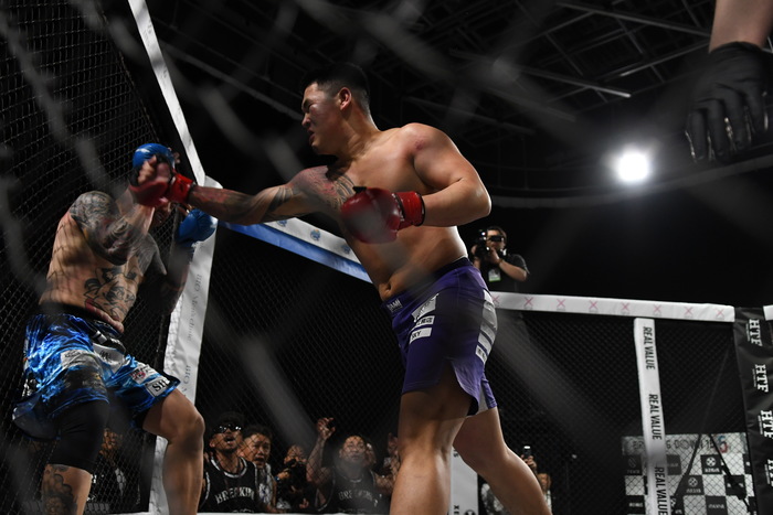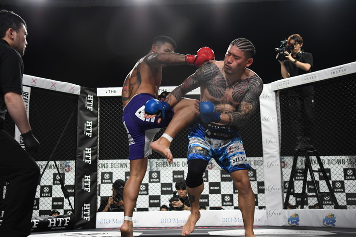 1R、打ち合いになるがパンチを当てながら前進するのは藤井。蹴りも混ぜる。右ミドルを蹴っていく藤井はクリンチからのパンチ、つかんでのヒザ。しかし終了直前、モギが左右フックをヒットさせて藤井をグラつかせた。