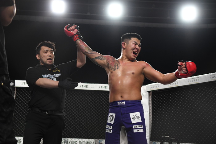 判定は0-0でドロー。延長戦へ。再びパンチを出しながら前へ出る藤井だが、そこへモギが右。一瞬藤井がヒザをつく。パンチを上手く当てていくモギだが、ややバテたか藤井が前へ出てパンチを当てていきモギは組む場面が目立つ。