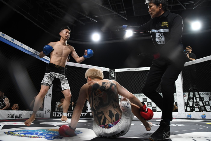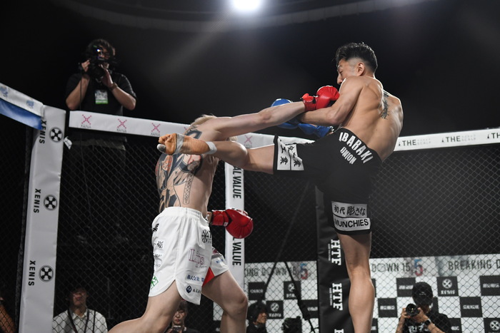 1R、小林の右ローにカズが左フックのカウンターでダウンを奪う。右ミドルを蹴る小林にカズは左右フック、パンチで前へ出る小林だがカズが的確にヒットを奪っていく。最後は余裕を見せて下がって回り込んだ。