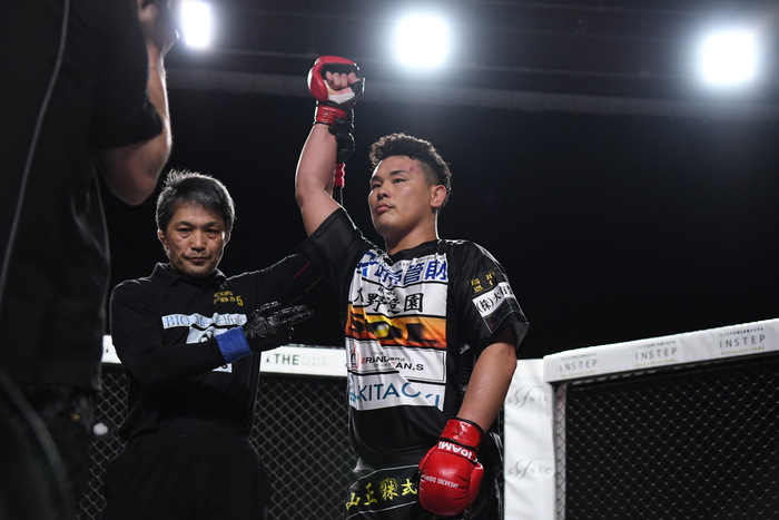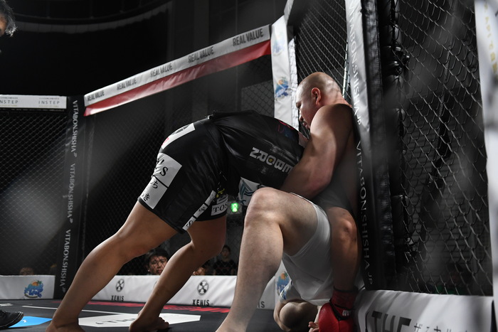 1R、サウスポーの金田一は左ストレートからダブルレッグでテイクダウン、ブレイク間際にパウンドを打つ。スタンドに戻ると吉田の右をかわした金田一がダブルレッグ。これもブレイク。金田一の右フックに倒れた吉田に金田一がパウンド。