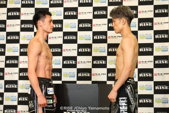 第8試合のバンタム級(-55kg)3分3R延長1Rで対戦する、RISEバンタム級王者・大﨑孔稀(OISHI GYM/)とフェザー級1位・門口佳佑(EX ARES)は共に54.95kgで計量をパス。