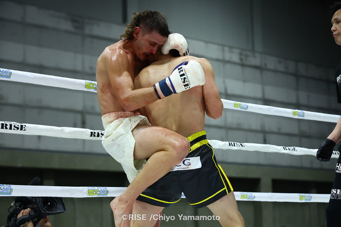 4R、ボディの打ち合いからバックスピンキックを放つ大﨑。ニコルソンはジャブ、ローを出しながら回り込む。大﨑は左ボディから右ロー、飛び込んでの右フック。左右ボディからの右フック。圧倒されながらも手数を出すニコルソン。さらに左ボディ、左フック、右ストレートと次々とパンチをヒットさせていく大﨑だが、ニコルソンはタフだ。大﨑の左フックに組み付くニコルソン。大﨑が前へ出来るとヒザを出して組み付くニコルソンはクリンチが多くなる。