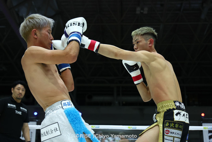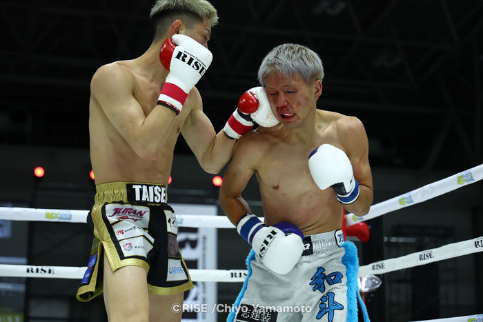 2R、和斗は左右フックで勢いをつけて前へ出る。近藤はジャブ、左ミドル、左フック。アグレッシブに動く和斗に近藤はワンキャッチで崩してからの右ストレート、さらにヒザ。打ち合いになると近藤が左フックをヒットさせていき、さらにヒザを突き刺して左ボディも強烈な左フックがヒットするが和斗は耐える。そこへ近藤がヒザ、左ボディ。ボディと顔面を振り分けて攻める近藤。和斗はフラフラになりながらもパンチを振っていく。近藤の右ストレートがヒットして耐える和斗。
