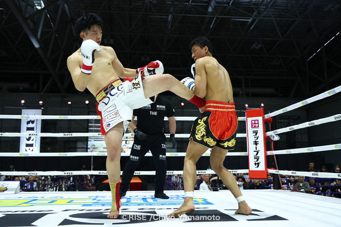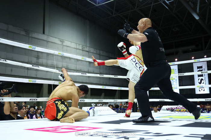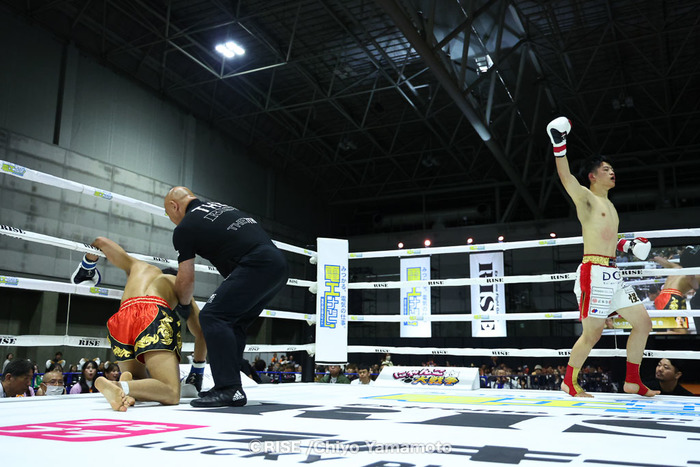 1R、序盤から強い右カーフを蹴っていく惺也はミヤノイリが前へ出てくると右ミドル。惺也の右カーフで大きくバランスを崩すミヤノイリ。左右フックを打つミヤノイリに惺也が左フック、ダウンを奪う。