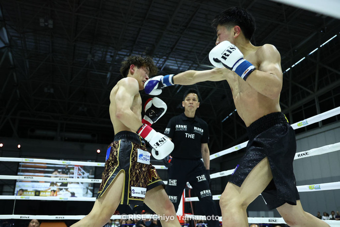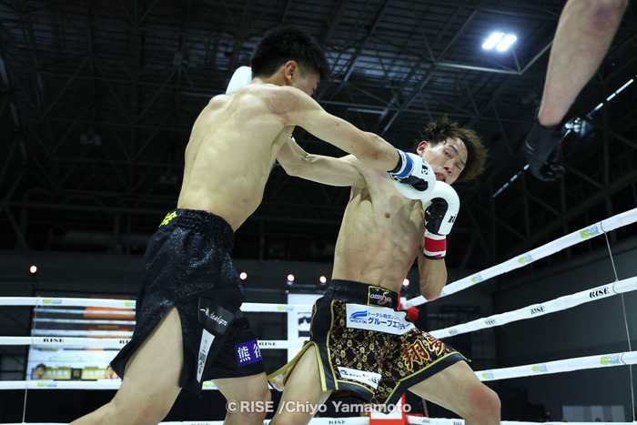 1R、ロー&インローの蹴り合いからスタート。先に打ち合いを仕掛けたのは大久保で左右の連打を叩き込む。正木はロープを背負うが左フックを返す。パンチの連打から胴廻し回転蹴りを繰り出す大久保。パンチを顔面とボディへ散らし、接近するとワンキャッチからのヒザも使う。正木はサウスポーにもスイッチして左ストレートからワンキャッチのヒザ。残り30秒で前へ出る正木が右ストレート、左フックをヒット。大久保もボディから顔面へつなぎ、右ミドルを蹴る。