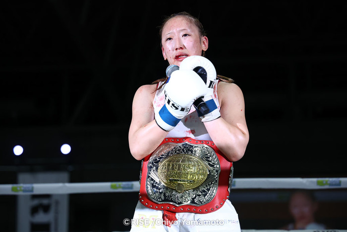 宮本はマイクを持つと「こうやってたくさんの方々に応援されて王者になれました。一人の力では獲れなくてサポートがあってのおかげです。感謝の気持ちでいっぱいです。小林選手強かったです。でも私が王者になったからには王者らしい行動をし、私らしい王者の姿を見せたいと思います」と泣きながら語った。