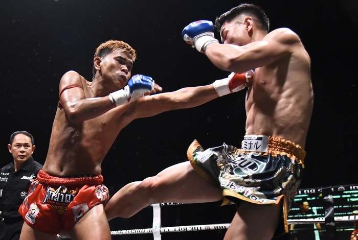 2R、竜哉が右ミドル、右ロー、ゲンウボンは左ミドルから左ストレートを伸ばす。竜哉が右ローを蹴るとゲンウボンは前へ出てヒジを当てようとする。ゲンウボンの右フックにバランスを崩した竜哉だが、右ローを蹴っていく。ゲンウボンは左ヒジ。右ミドルを何発も当てていく竜哉、ゲンウボンも負けじと左ミドル。