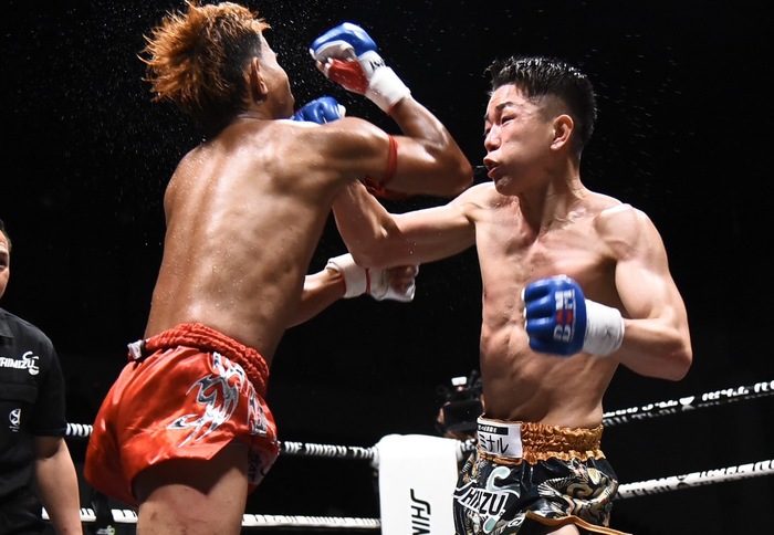 3Rも竜哉は右ミドルと右ロー、ゲンウボンは左ミドル。ゲンウボンが縦ヒジに行くと竜哉は右をこつんと当てる。前に出るゲンウボンだが竜哉の右ミドル、前蹴りで止められる。ステップで前後に動く竜哉はゲンウボンが前に出てくると下がって距離を取り右ミドル。竜哉が左フック、ゲンウボンは右ローを蹴るが追い足は遅く竜哉を捉えられない。ゲンウボンの攻撃をかわして右ストレートを打つ竜哉。打ち合いに来たゲンウボンに竜哉も打ち合い、右をヒットさせた。