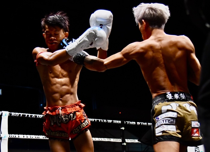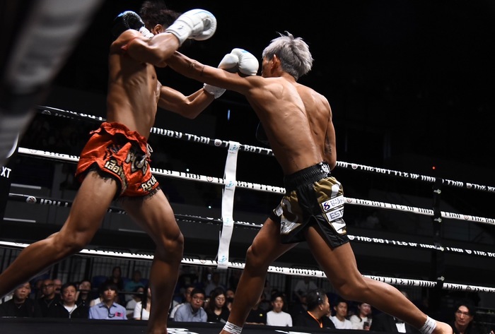 1R、始まると同時にサウスポーの黒だが左ローから左ストレートの連打でどんどん前へ出る。シワラットも打ち合いに応じてパンチが交錯したが、一度離れる。