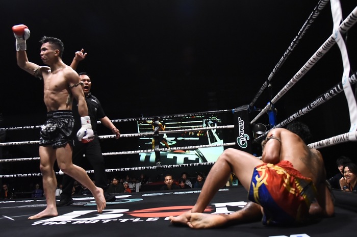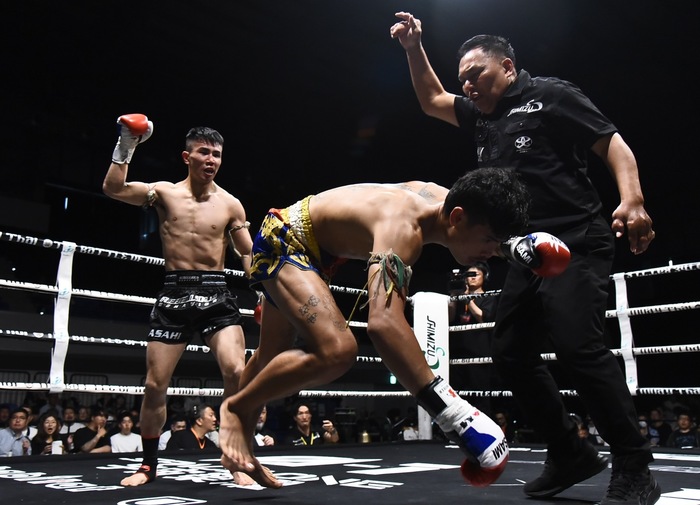 3R、パランペットの右前蹴りをキャッチした朝陽は右ボディストレートを突き刺してダウンを追加。朝陽は右ハイ、左右フックから左ボディ。パランペットは左ミドルで応戦し、左ヒジを放つ。朝陽が左ボディから左フック、パランペットは蹴りを出すが朝陽にかわされる。朝陽の左フックからの右縦ヒジで前に倒れたパランペット。