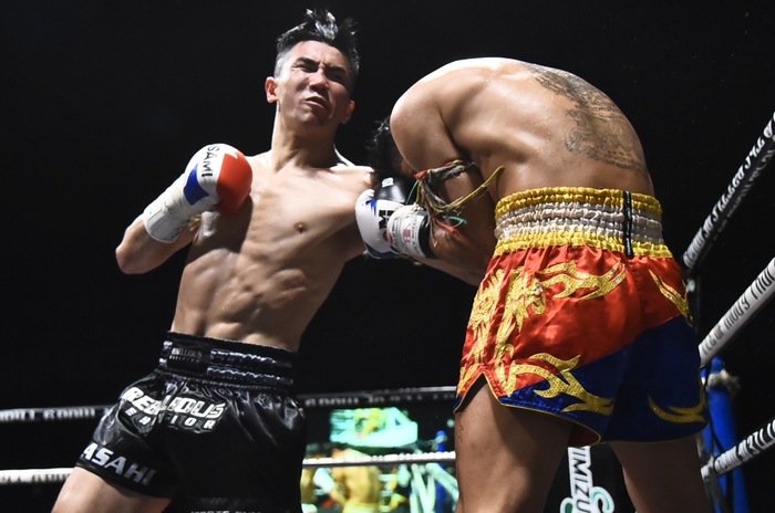 2R、朝陽が右カーフ、パランペットは右縦ヒジを打つ。朝陽は左フック、前へ出て来るパランペットに今度は朝陽が左縦ヒジを打ち込みパランペットが大きくグラつくが、すぐに左ミドルを蹴る。朝陽は左ボディと左フック、パランペットはダウン寸前も立ち続ける。朝陽は右カーフを蹴っていき、パランペットはダメージの回復を待つためか距離をとる。朝陽の右カーフ、左ボディをもらうとサウスポーになるパランペット。