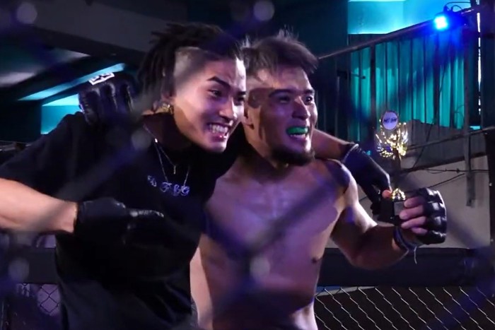 1R、サウスポー構えの日置の左ローに右ローを合わせて崩した下田がトップに。下の日置の三角狙いを外してトップからパウンド、鉄槌。立ち上がる日置に首相撲から右ヒザでダウンを奪い、レフェリーが間に入った。下田兄弟揃っての勝利。