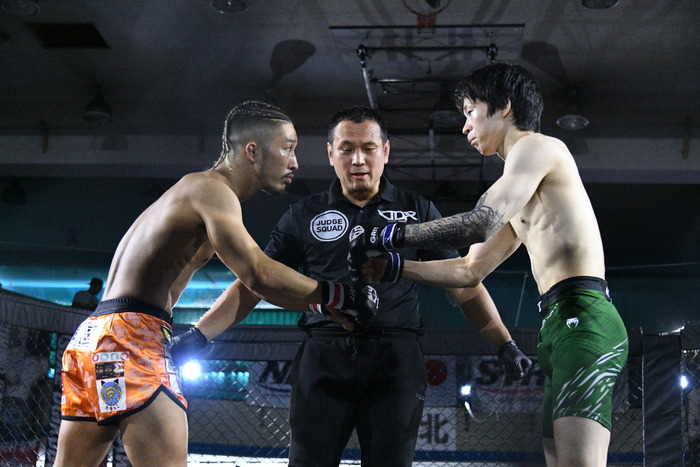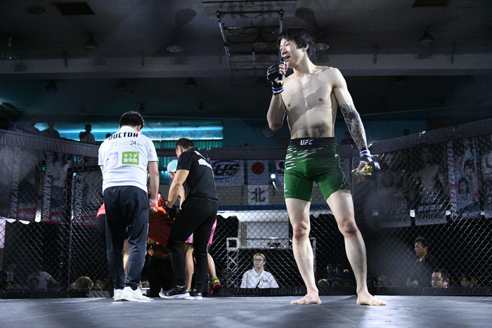 2000年生まれ、25歳・無敗の竹内は、試合後ケージのなかで「4戦4勝の竹内です。フライ級のベルト目指してやってるんですけど、このままベルトを獲っちゃってもいいんですけど、ベルト獲る前にやりたいことがあって、クレイジールールで本物の漢と素手で殴り合いたいなと思っています。根性のあるやつ、雑草魂のあるやつ、誰でも待っています」と、王者・荻窪祐輔に挑戦する前に、3R目が素手のミックスルールでの試合を希望した。
