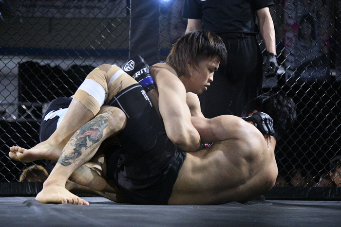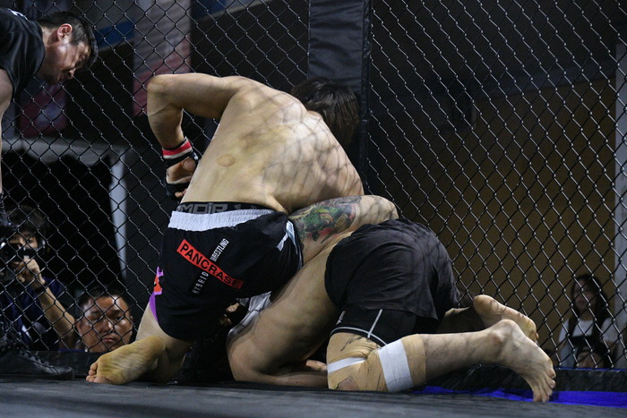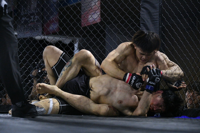 1R、ひとまわり大きな森に、菊地は先にワンツーで前に。組む森は四つからヒザ。崩してテイクダウン。ハーフの菊地の潜りを剥がして中腰からパウンド。菊地は左足をたぐり足関節狙いも潰してパウンド、ヒジの森。