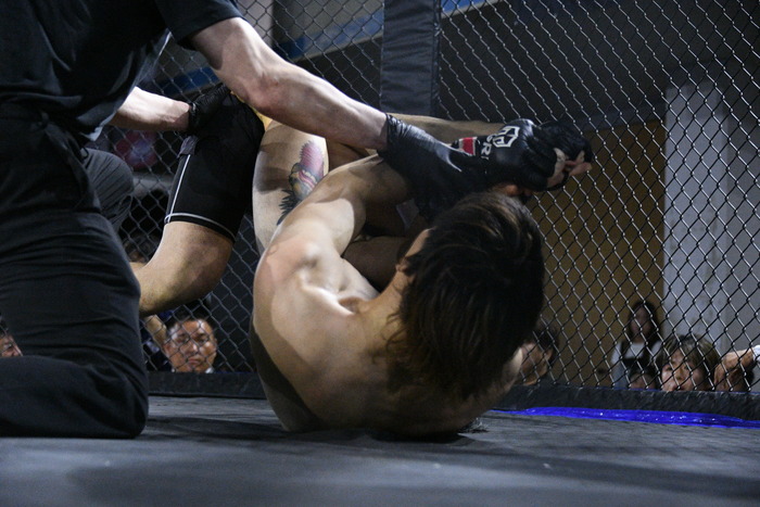 菊地は亀になるとリストコントロールの森はバックから4の字ロック。バックからパンチ、リアネイキドチョーク狙いからバックマウントに移行。パウンド連打、亀の菊地の右腕をキムラに極めた。