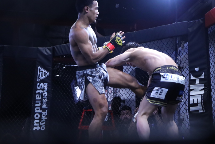 1R、右を当てたオルニドに腰を落とした熊崎だが、2度のテイクダウンへ、足を抜く、あるいはバッククリンチに正対して離れるオルニドは強い右ロー、熊崎の左には左ミドルを突く。