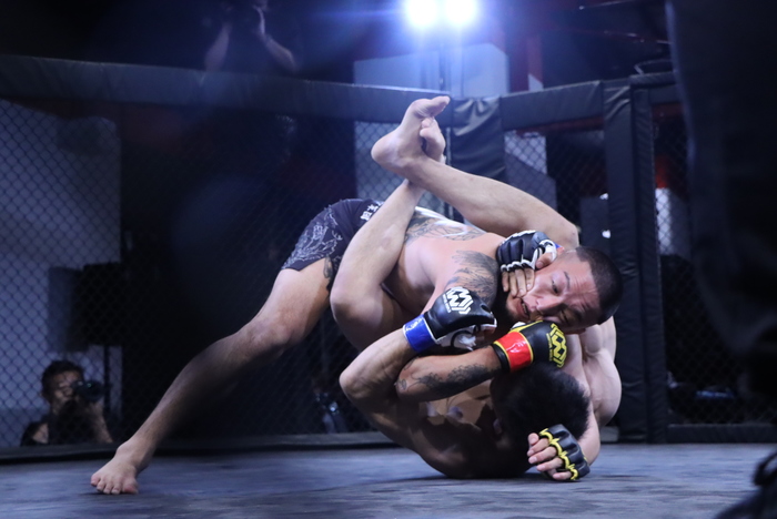 1R、サウスポー構えの上田とオーソの石井の喧嘩四つ。詰める上田の左から右に腰を落とした石井。上田のバック狙いをリストコントロールさせずに落としてトップに。強いパウンドに上田も下から蹴り上げ(グラウンド状態でイエロー)。内ヒール狙い。石井も足関節で応戦。互いに鉄槌。