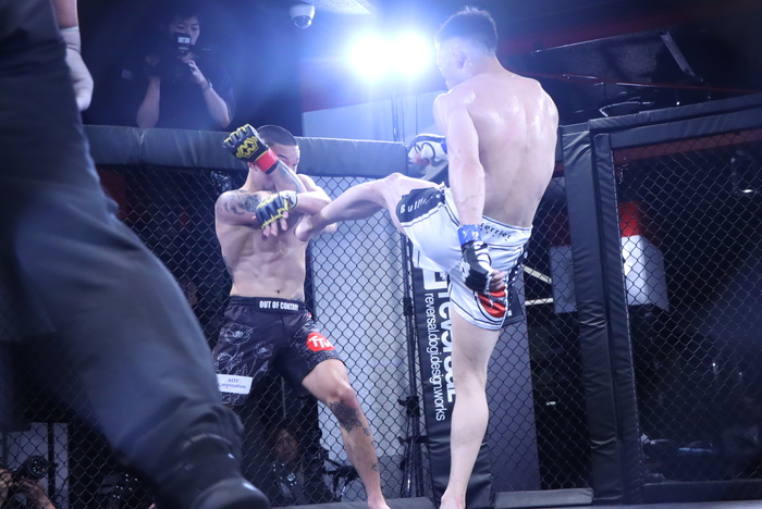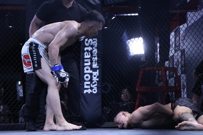 2R、サウスポー構えの上田はジャブ、強い左インローをダブルで。右を狙う石井に、上田は左オーバーハンドも繰り出し、打撃で圧力をかける。しかし詰めたところで石井の左ボディストレートと、左インローが交錯しまともにローブローに。大きな音を立ててファールカップに打突音。石井は悶絶して動けず、嘔吐も。試合は止められた。