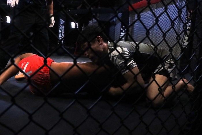 1R、ケージを背にする椿。シングルレッグ、ダブルレッグテイクダウンの椿が2P。大脇はニンジャチョークを合わせ、椿が仰向けで防いで下になり2P。大脇は腕十字を狙う。椿は強いポスチャーで作らせずトップで2P。大脇は下から足を狙いながら立ち上がりスクランブルとして1P。椿が4-3でリード。