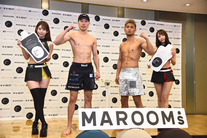 メインイベントのKNOCK OUT-BLACKライト級(62.5kg)タイトルマッチ3分3R延長1Rで対戦する、王者・大谷翔司(スクランブル渋谷)は62.45kg、挑戦者・大沢文也(ザウルスプロモーション)は62.45kgでそれぞれ計量をパス。