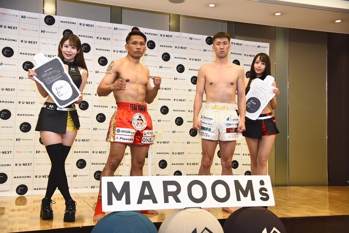 セミファイナル(第9試合)のKNOCK OUT-REDスーパーウェルター級タイトルマッチ3分3R延長1Rで対戦する、王者クンタップ・チャロンチャイ(タイ/TEAM KUNTAP)は初回70.20kgだったが、再計量では69.65kgで無事パス。対する挑戦者の津崎善郎(LAILAPS東京北星ジム)は69.85kgで一発パスした。