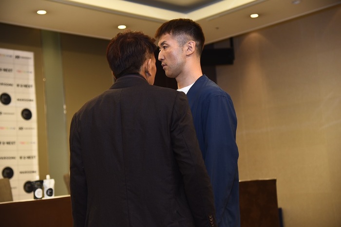 フェイスオフでクンタップ(左)が津崎に詰め寄り、険悪な雰囲気に(C)KNOCK OUT