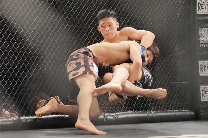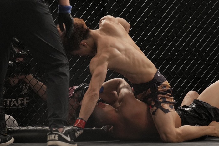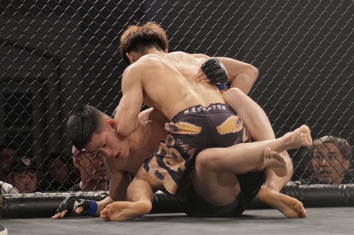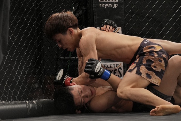 1R、両者オーソドックス。カーフの蹴り合い。黒部のカーフキックで足が流れる友利。黒部タックルへ。テイクダウン。ハーフで固めた黒部。。黒部の首に腕をギロチンに巻いた友利だが、黒部がヴァンフルーチョークに。肩で首にプレッシャーを掛けていく。苦しげな表情を見せた友利だが外れた。ケージで体を起こそうとする友利にヒジを入れる黒部。下からホールドする友利だが、クラッチを切った黒部がパウンドを落とす。足を超えてマウントに。黒部が右のヒジを連打!連続で入りレフェリーストップ!