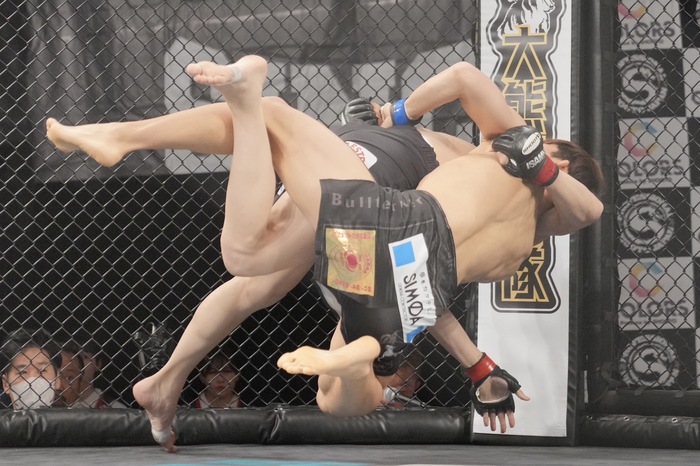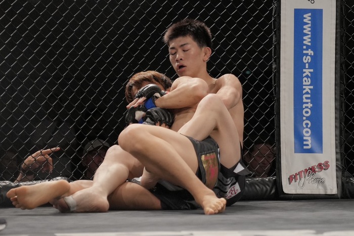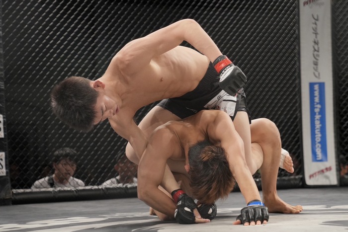 仰向けの体勢からマウントに移行しようとした瀬戸口だが、その瞬間に反転した塚本が上を取る。ケージを使って立ち上がった瀬戸口。内股で投げるが、投げられた勢いで上を取る塚本。