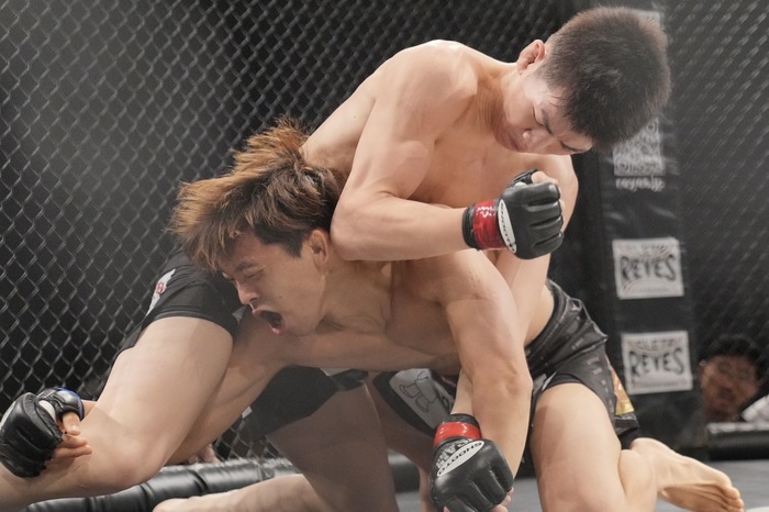 1R、サウスポーの瀬戸口にオーソドックスの塚本。瀬戸口が詰めて左を入れるとタックルに入る。テイクダウンするが、塚本すぐにスクランブルで逃れようとする。