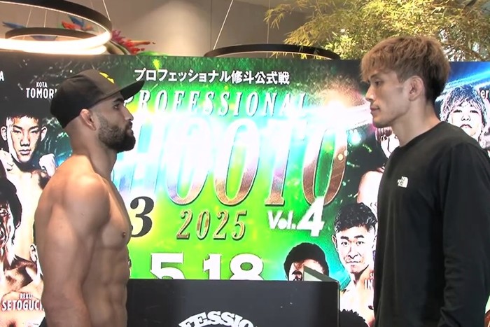 かわって、ミドル級からウェルター級転向初戦の岩﨑大河と、コロンビアFFC王者のアレクシス・カンポスの試合がメインにスライドしていたが、岩﨑大河が80.8kgで体重超過。本誌の取材によれば、カンポスは77.1kgに体重調整できていたが、岩﨑が落とせないことでキャッチウェイト戦に向けてリカバリーに入っていたため、400gの体重超過とコールされた。最終的に両者体重は折り合わず、試合は中止となっている。
