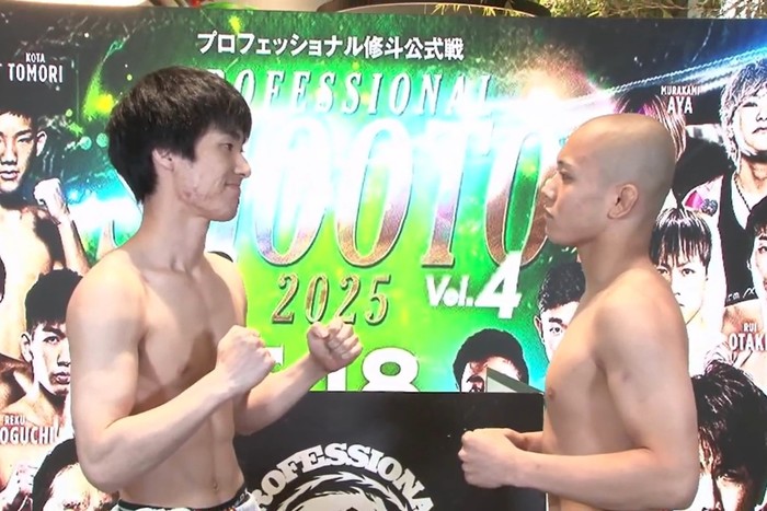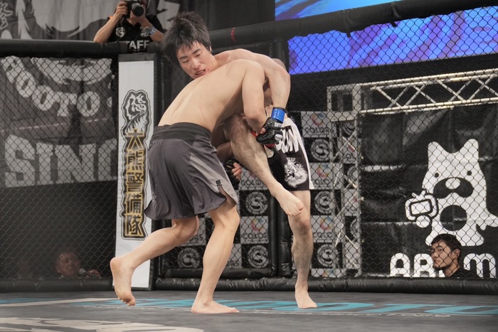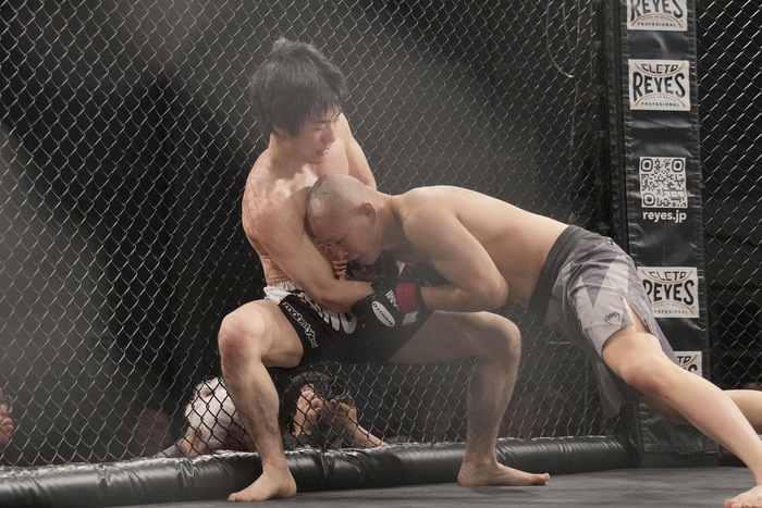 1R、オーソドックスの梅木にサウスポーの大竹。開始と同時にダッシュして間合いを詰めてパンチを打ち込む大竹だが、梅木が四つに組んでテイクダウンを狙う。ケージを背負ってこらえる大竹。大竹が入れ替えると逆に外掛けでテイクダウン。