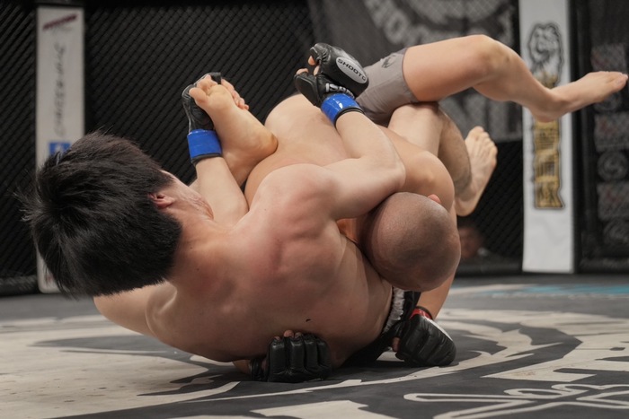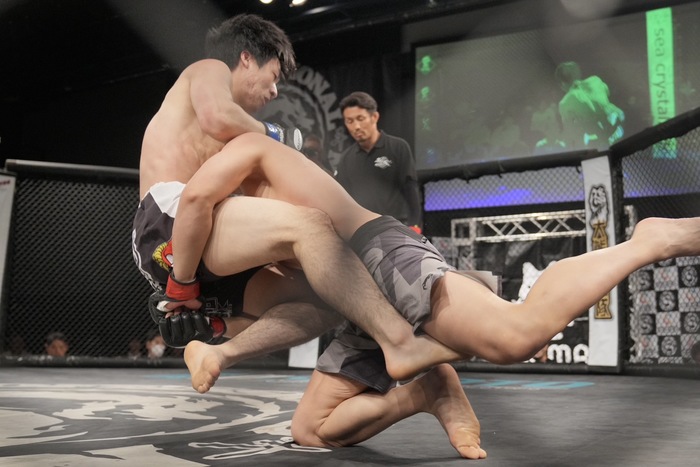 2R、梅木が組み付くとケージに押し込み、1Rと同じ展開に。シングルレッグでテイクダウンして再び大竹のクローズドガード。梅木がパスを狙うが大竹がまたラバーガードに。