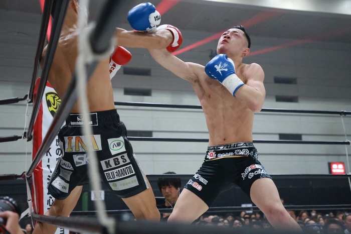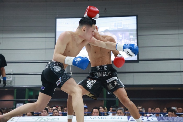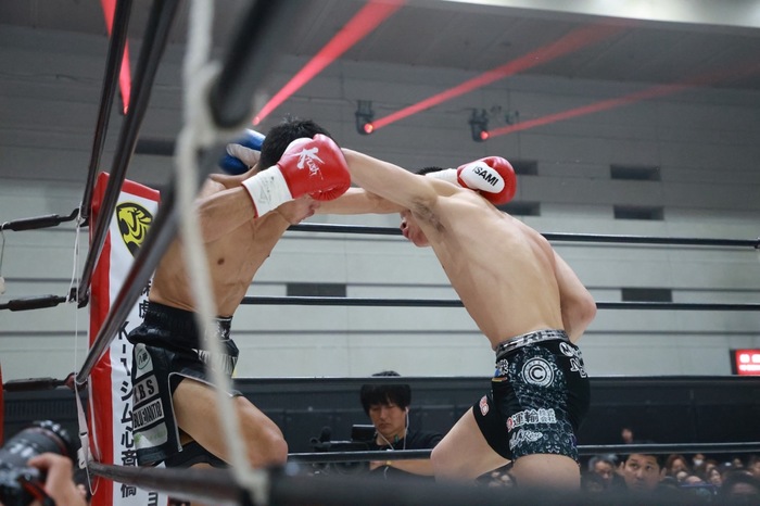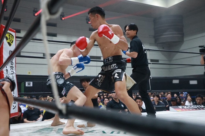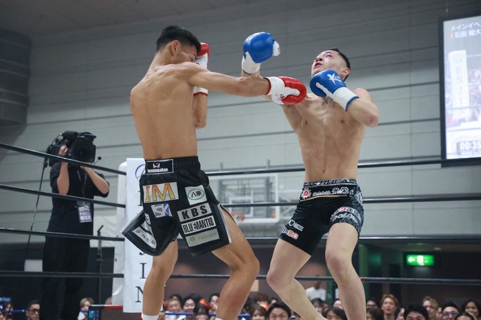 1R、サウスポー同士。松本は左カーフを蹴り、石田が右をヒットさせるとすかさず松本が左ストレート。左カーフを蹴って左ストレートで前に出る松本に石田も左カーフ。ジャブの差し合いから左を打ち合う両者。松本の左ストレートにグラついた石田に松本が右ボディと左右の連打でラッシュを仕掛けるが、石田が右フックのカウンターでダウンを奪う。左ストレート、右フックで前に出る松本へ石田が左ストレートをしっかり当てる。