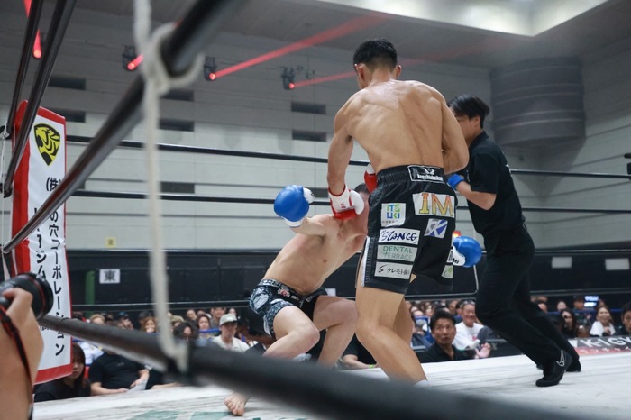 2R、左カーフを蹴る松本に左ストレートを合わせに行く石田。ジャブで距離をとる石田はカーフを警戒している様子。松本が前へ出て打ちに行くと、互いに左ストレートから右フックを返したがヒットさせたのは石田、ダウンを奪う。松本は打ち合いに行くが、スピードが鈍っている。そこへ石田が左ストレートの連打。互いに左ストレートを出し合うが、しっかり見て当てるのは石田。松本がグラついたところでレフェリーがストップした。