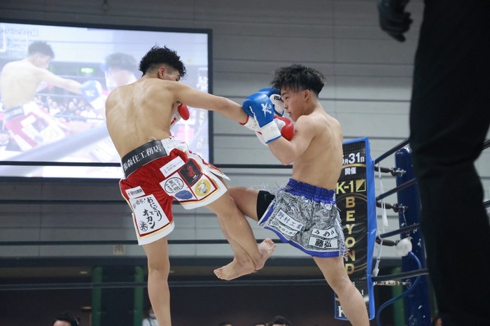 2R、大地が左右フックでラッシュをかけるとゆいらも右を打ち返す。大地はここで右ローを連打、この右ロー4連発が決まり、ゆいらはロープにもたれるかかるように崩れ落ちてダウン。そのまま大地のKO勝ちとなった。