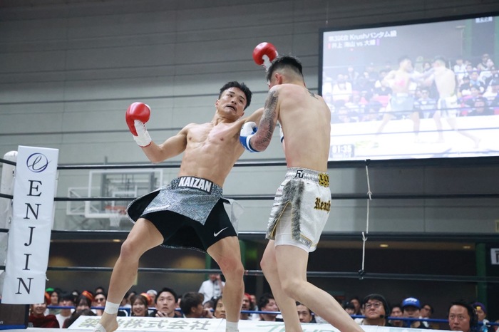 1R、大輝が左ストレートから左ハイ、井上が前に出てくるとヒザを突き刺す。井上は距離を詰めてパンチを打ちに行くが、大輝は左右に動いてヒザ、左インロー、左三日月。前に出てワンツーを打つ井上に左ストレートを返す大輝。前に出て左ボディ、左フックの井上に大輝はラッシュをかけて押し返す。