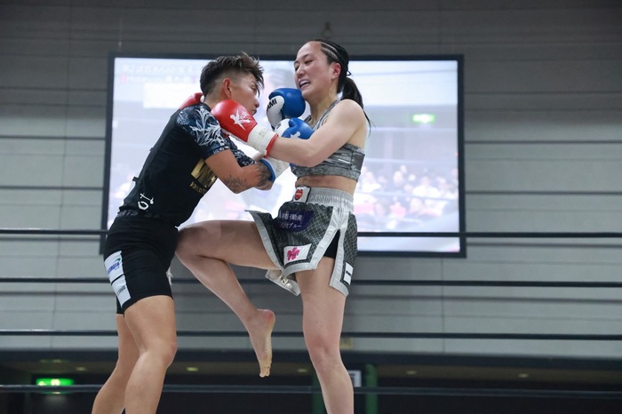 1R、いきなりバックキックを放つHotaru。青木はパンチ&ローで前に出るが、Hotaruは接近するとヒザ、離れると後ろ蹴り、バックブロー、ハイキックを放つ。後ろ蹴り、ヒザ、パンチ、左ミドルでボディを攻めまくるHotaruは右カーフも蹴る。青木は接近しての打ち合いに持ち込んでいく。押し合いになっても両者下がらず、Hotaruはヒザを蹴る。