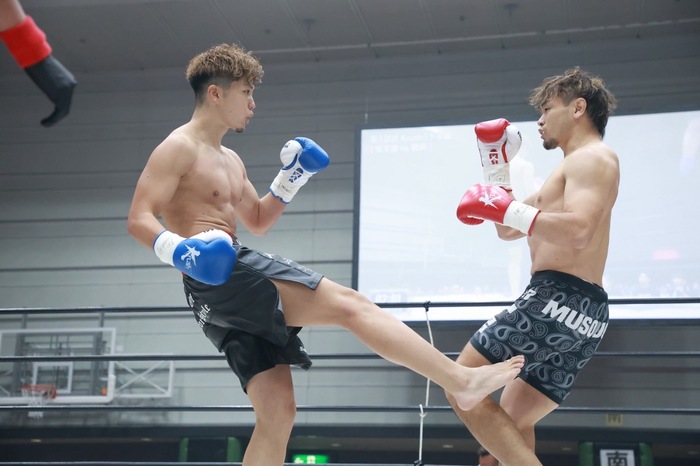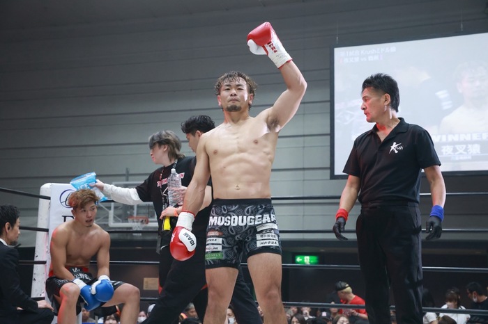 1R、前に出るのは夜叉猿で接近すると左右フック。互いに右カーフを蹴り合う。戦熊は下がりながらもジャブを突く。夜叉猿が飛び込んでの左フック、戦熊も打ち合いに応じて右ストレートを打つ。夜叉猿がジャブ2発から右ストレート、戦熊は右ローを蹴って離れる。夜叉猿がロープを背負った戦熊に左ボディから左フック、戦熊も右フックを返す。右フックをヒットさせた戦熊がラッシュをかけるが、夜叉猿も右フックを返す。